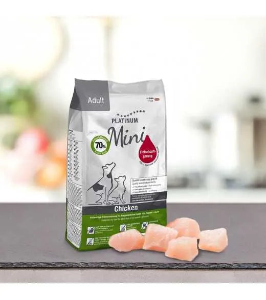 For 1 kilogram of finished Platinum Adult Chicken dog food, 1.27 kilograms of fresh chicken meat are used, and in the finished Platinum dog food, the fresh meat makes up 70% of the feed.